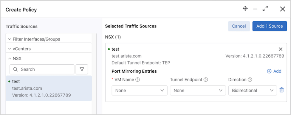 Configure the NSX source VMs to mirror traffic to the default tunnel endpoint specified in the NSX instance’s configuration, with an optional direction: