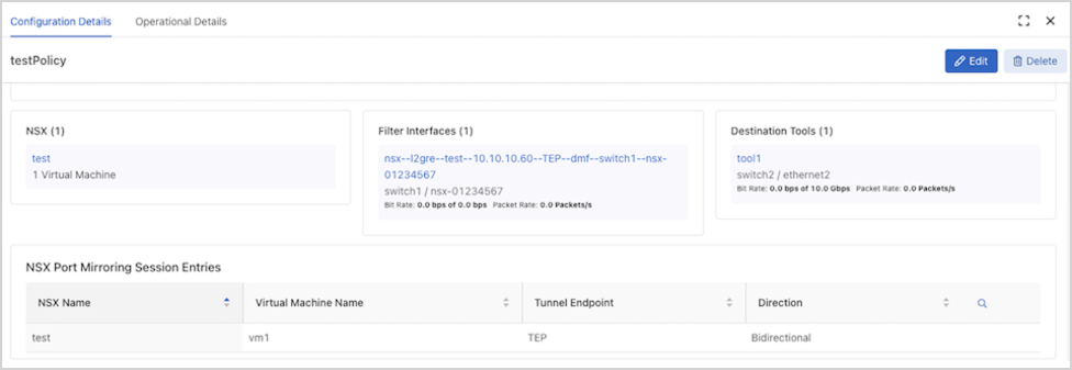 Note: Mirror session creation may initially fail on NSX, but the NSX Manager may recover and successfully create the mirror session later. This fabric error is cleared and the mirror session info is then visible from DMF. If the mirror session config is absent on NSX, delete the NSX monitoring config from the DMF policy and reconfigure it, or delete the policy and recreate it.