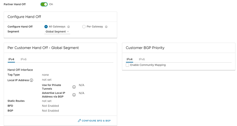 You can configure a Gateway to hand off to Partners. The Gateway acts as a Partner Gateway that enables you to configure the Hand off Interface, Static Routes, BGP, and other settings.