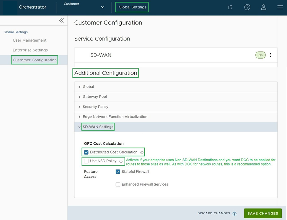 2. On the Customer Configuration page, navigate to the Additional Configuration > SD-WAN Settings > OFC Cost Calculation section and configure the following: