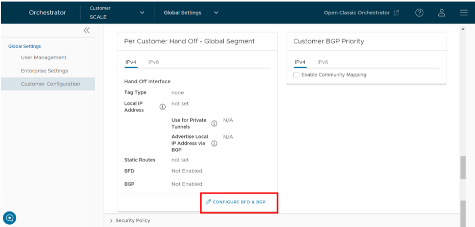 Note: When you modify the Security Policy settings, the changes may cause interruptions to the current services. In addition, these settings may reduce overall throughput and increase the time required for VCMP tunnel setup, which may impact branch to branch dynamic tunnel setup times and recovery from Edge failure in a cluster.