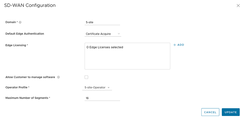 Operator Profile Select an Operator profile to be associated with the Customer from the available drop-down menu. This field is not available if Allow Customer to Manage Software is selected. For more information on Operator profiles, see the topic Manage Operator Profiles in the Arista VeloCloud SD-WAN Operator Guide.