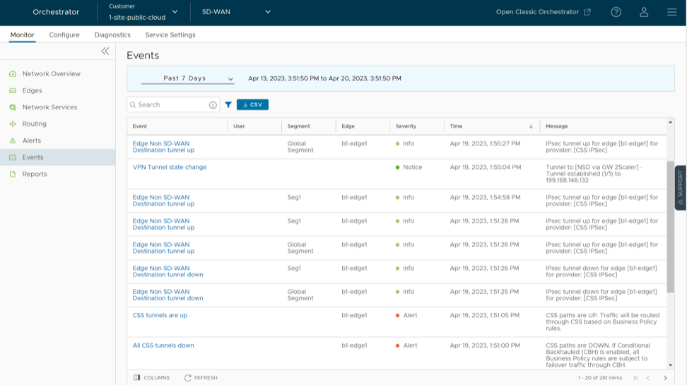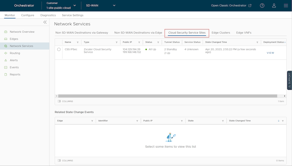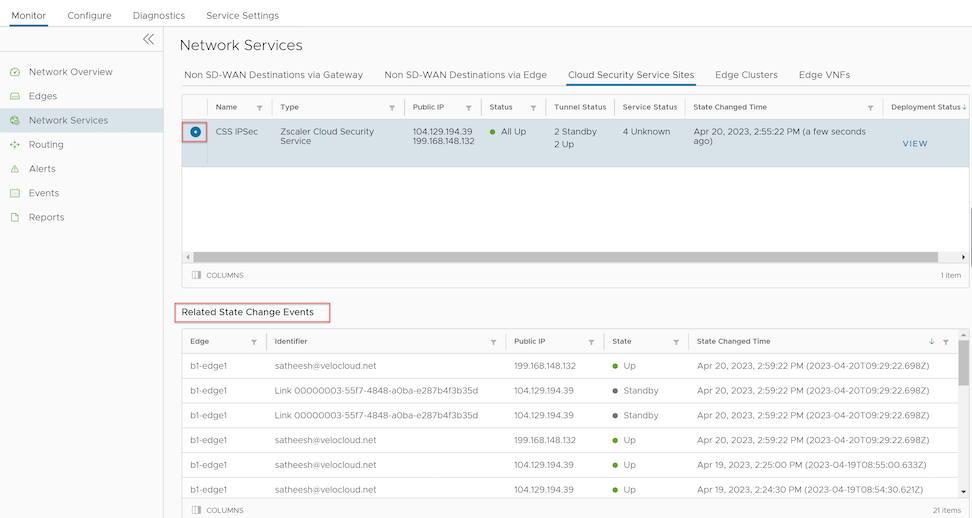 Note: The numbers that appear on the Tunnel Status and Service Status icons signify the number of Edges associated with that state for the respective CSS provider.
