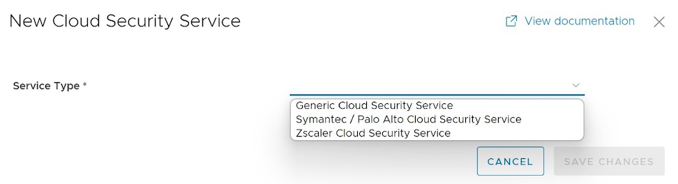 - In the New Cloud Security Provider window, select a service type from the menu. VeloCloud SD-WAN supports the following CSS types: