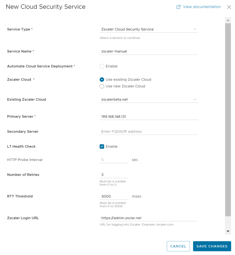 Table 1. Security Options Option Description Service Name Enter a descriptive name for the cloud security service. Primary Point-of-Presence/Server Enter the IP address or hostname for the Primary server. Secondary Point-of-Presence/Server Enter the IP address or hostname for the Secondary server. This is optional. - If you have selected Zscaler Cloud Security Service as the Service Type, then you can choose between manual deployment and automated deployment by selecting the Automate Cloud Service Deployment checkbox. Also, you can configure additional settings such as Zscaler Cloud and Layer 7 (L7) Health Check details to determine and monitor the health of the Zscaler Server.