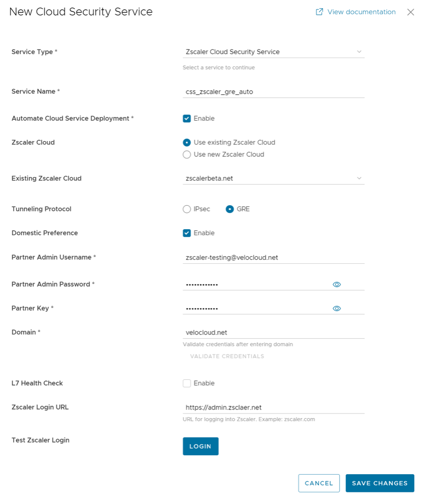 Table 2. Additional Configuration Parameters Option Description Domestic Preference Enable this option to prioritize Zscaler data centers from the country of origin of the IP address even if they are farther away from the other Zscaler data centers. Note: Previously, the Domestic Preference option was only available for GRE tunnels. Starting with the 6.0.0 release, this option is configurable for establishing IPsec tunnels as well.Zscaler Cloud You can choose to use the existing Zscaler clouds or use a new Zscaler Cloud. If you choose to use the existing cloud then select a Zscaler cloud service from the drop-down menu. For new Zscaler cloud, you must enter the Zscaler cloud service name in the textbox. Partner Admin Username Enter the provisioned username of the partner admin. Partner Admin Password Enter the provisioned password of the partner admin. Note: Starting from the 4.5 release, the use of the special character "<" in the password is no longer supported. In cases where users have already used "<" in their passwords in previous releases, they must remove it to save any changes on the page.Partner Key Enter the provisioned partner key. Domain Enter the domain name on which the cloud service would be deployed. Sub Cloud This is an optional parameter that Zscaler Internet Access (ZIA) customers use to have a custom pool of data centers for Geo-location purposes. Note: This option is available on CSS Zscaler automated deployment mode, if IPsec is selected for establishing tunnels. - Select Validate Credentials. If the validation is successful, the Save Changes button will be activated.