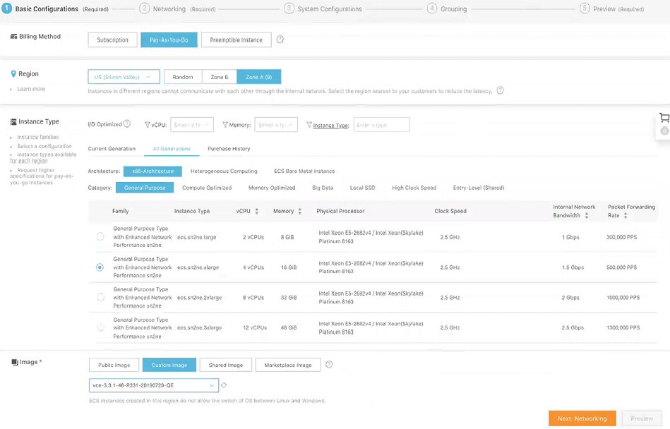- In the Instance Typearea, go to All Generations > x86-Architecture > General Purpose and select the 4 vCPU + 16 GiB memory (ecs. sn2ne.xlarge) instance type. The selected region determines the available instance type family.