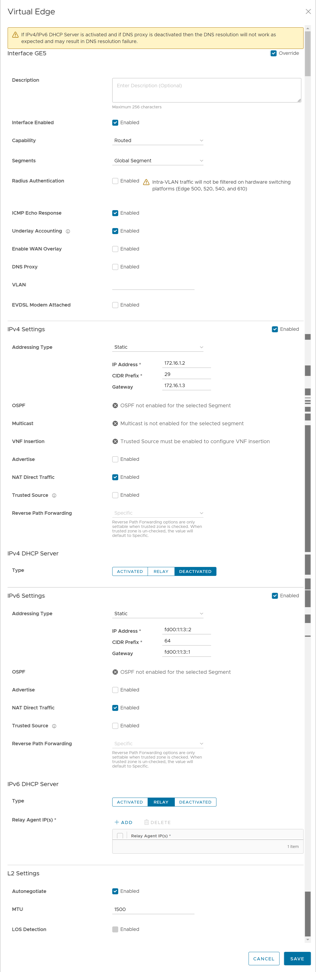 - Deactivate WAN Overlay and NAT Direct Traffic, as this interface will be used LAN-side, and select Save. For more information, see the topic Configure Interface Settings for Edges in VeloCloud SD-WAN Administration Guide.