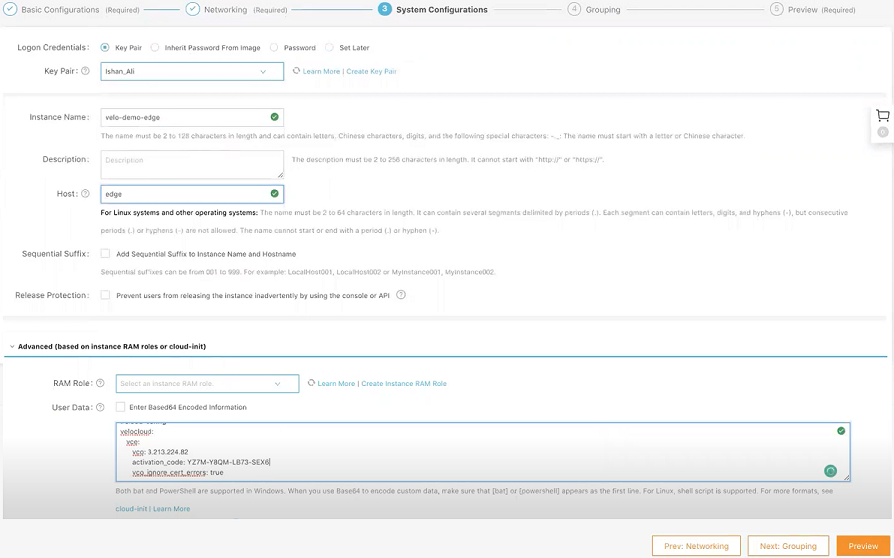Table 2. Additional Option descriptions Option Description Serial Number Enter the serial number of the Edge. If specified, the Edge must display this serial number on activation. Note: When deploying virtual Edges on AWS Edges, make sure to use the instance ID as the serial number for the Edge.Description Enter an appropriate description. Location select the Set Location link to set the location of the Edge. If not specified, the location is auto-detected from the IP address when the Edge is activated. - Select Add Edge. The Edge is provisioned, and the activation key is displayed on the top of the page. Make a note of the activation key to use it for launching the Edge from the AliCloud Console.